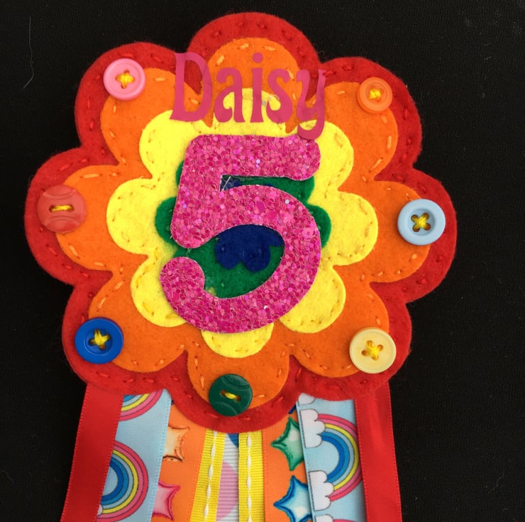 Birthday badges made in felt/fabric, many designs in any colours, this is a rainbow flower design Personalised with any age and name