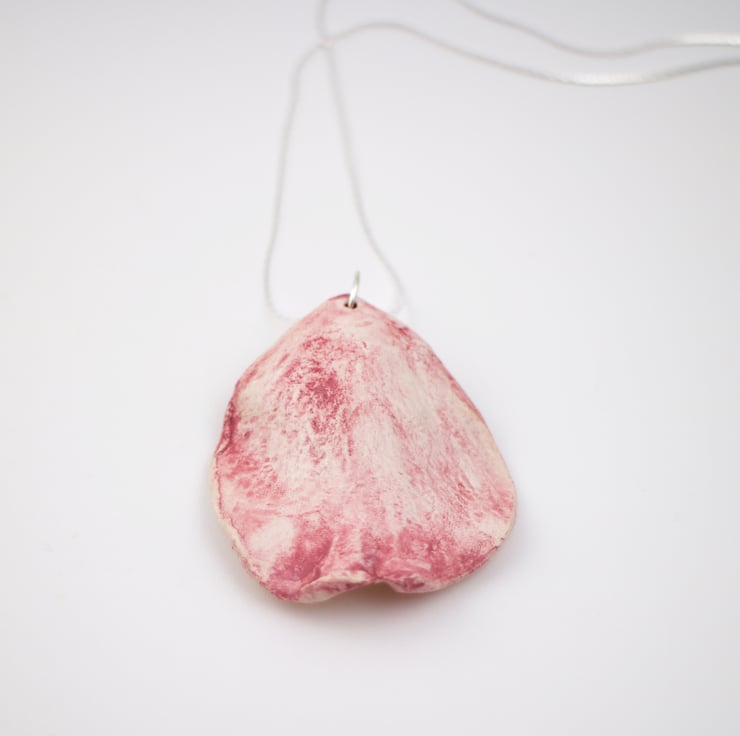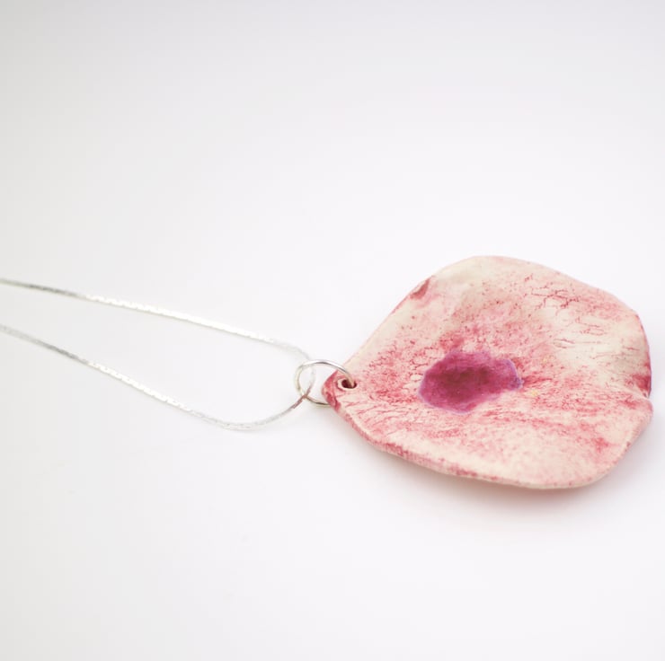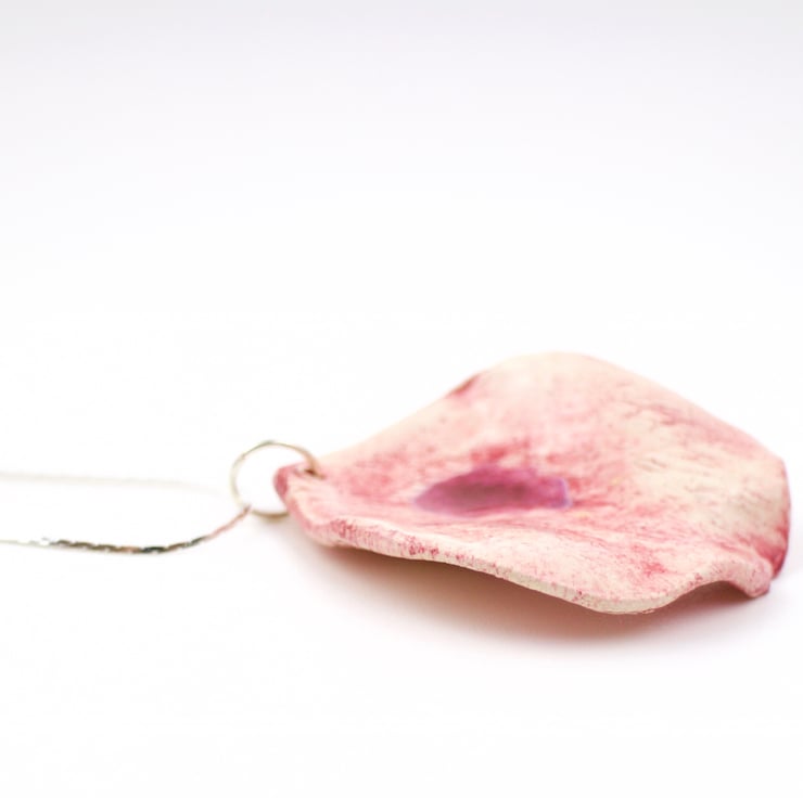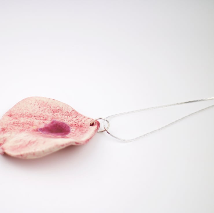A blush pink ceramic petal necklace with a textured watercolour glaze and pink glass.