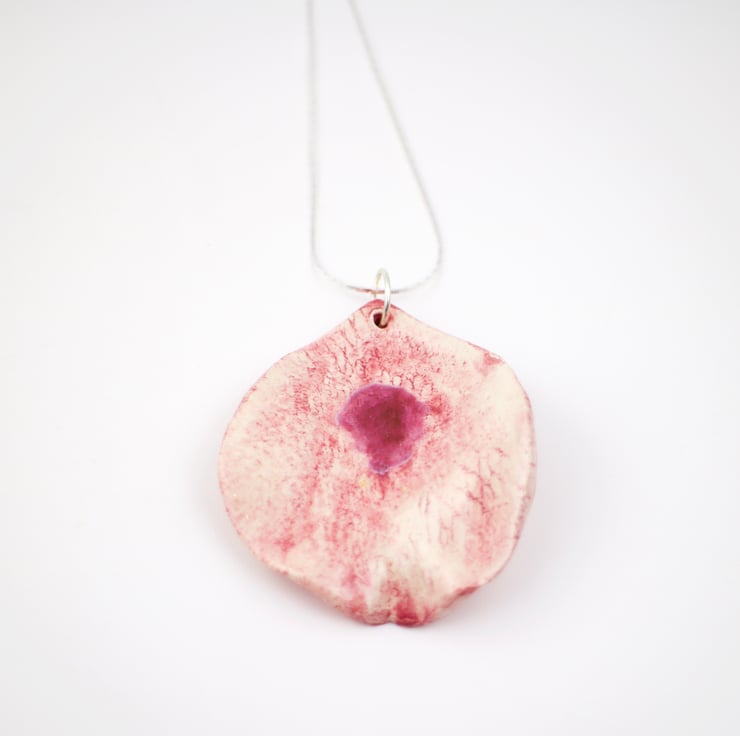 The petal measures 6x4.8cm and hangs from a silver tube bail and chain.