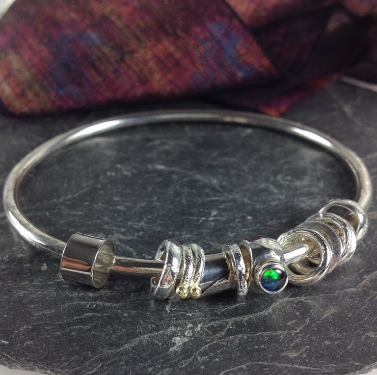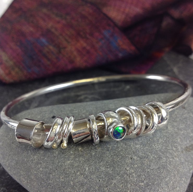 An Opal triplet is made from a piece of natural opal that has been backed with a dark stone to throw the colours and topped with a crystal dome to make it durable. Opals are very soft so this is a stronger option for a bangle.