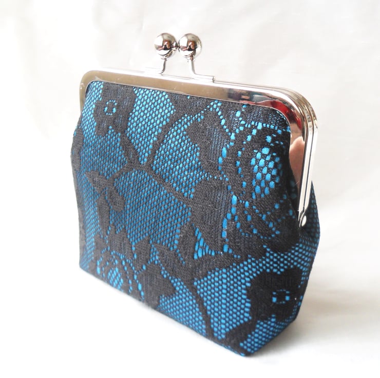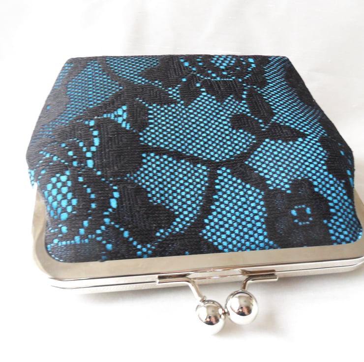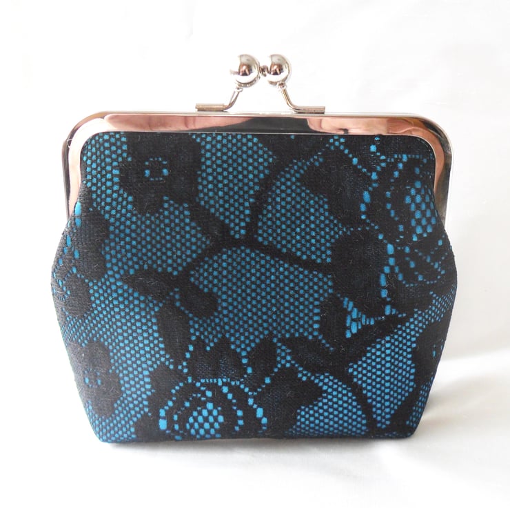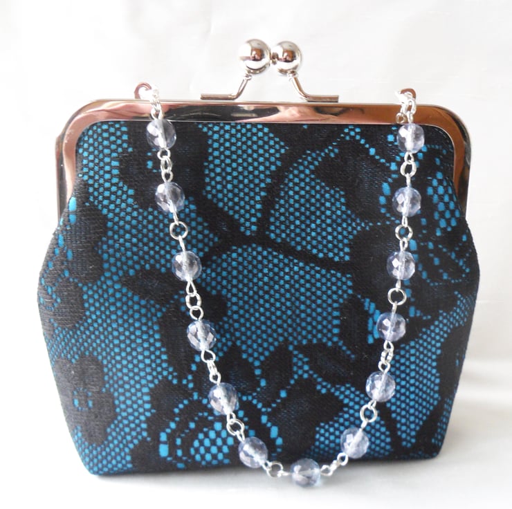 Small, but perfectly formed, this little bag is made using a teal and black lace fabric and may be used as a clutch if preferred. The smoky blue faceted bead handle can be tucked inside the bag or removed altogether. The 6" shiny silver frame closes with a bobble kiss-lock clasp.
