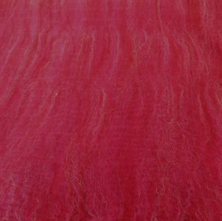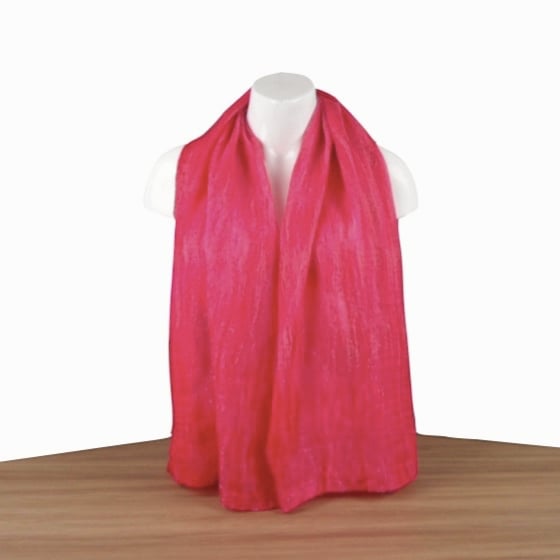 A blend of bright pink merino wool and beached tussah silk have been used to make this scarf. Working on a bright pink silk chiffon base fabric, a fine layer of the blended wool has been nuno felted onto both sides, a process which causes the wool fibres to migrate through the silk and bind with it.