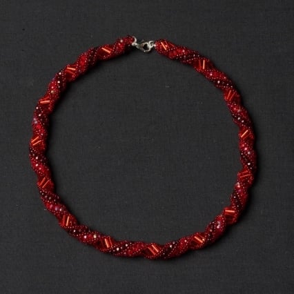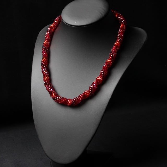 This sparkly spiral rope necklace is handmade by weaving together tiny seed beads, shiny bugle beads and polished 4mm faceted beads in shades of deep red. The necklace is quite lightweight as it has a hollow structure. The stitch used to weave the beads together is called Russian Spiral. There are many variations on this stitch and you will find other examples in my shop. This necklace should be fairly robust as it is stitched using the strongest tensile strength of Fireline braided beading thread. However the beads are glass and bugle beads in particular are quite sharp if they get broken, so the piece should be kept away from children. It is finished with a silver plated trigger clasp. The necklace will be sent wrapped in acid-free tissue paper in a sturdy cardboard box.