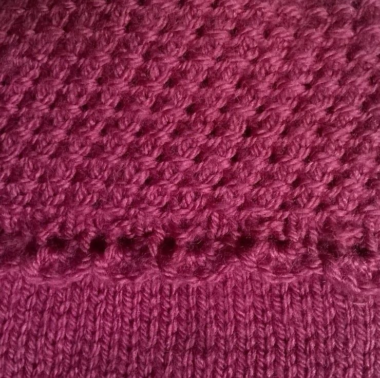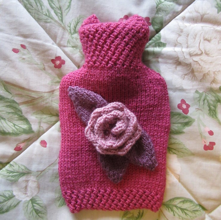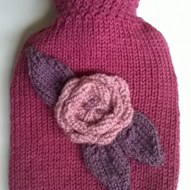 A ladies hot water bottle cover, hand knitted in a crushed raspberry coloured yarn. The body of the cover is knitted in stocking stitch which is a perfect setting for the dusky pink knitted rose and 3 dusky aubergine coloured rose leaves sewn on the front. The foot, neck and back of the cover are knitted in a beautifully delicate lacy stitch. The envelope style opening is finished using a knitted scallop edging. A perfect size to fit in the small of your back or over your shoulder to relieve the aches and pains of a hard days work in the garden!