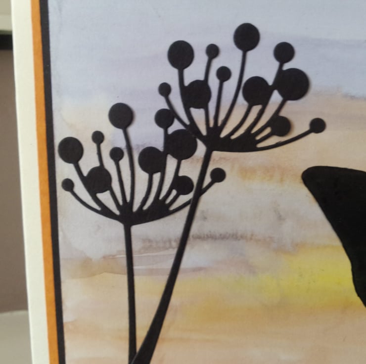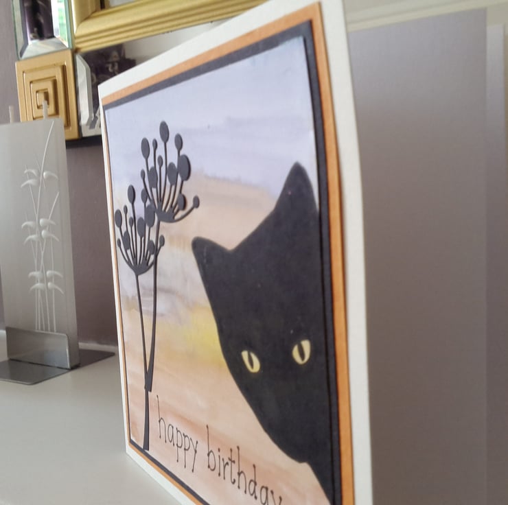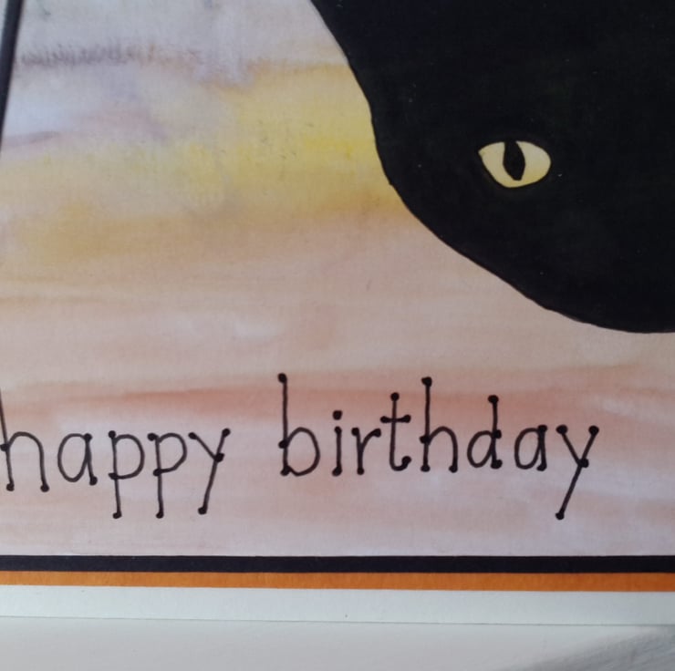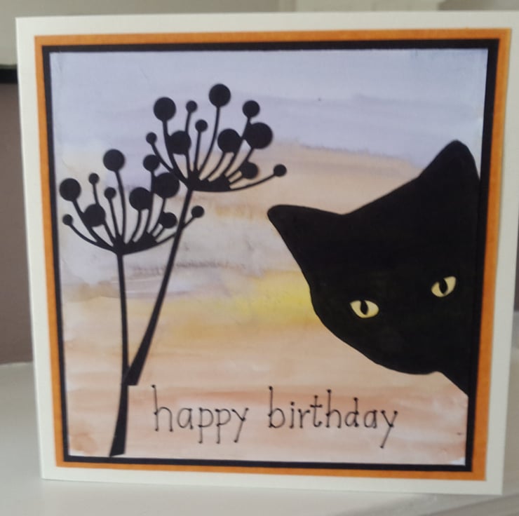 A completely handmade and uniquely designed card. Consisting of a water coloured background of an evening sky. A black cat hand drawn and hand coloured peeping round the edge of the card. A couple of lovely alliums silhouetted against the sky. A handwritten happy birthday in black ink. Mounted onto black card, orange card and then onto quality cream card.