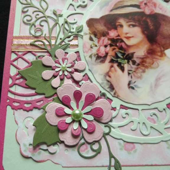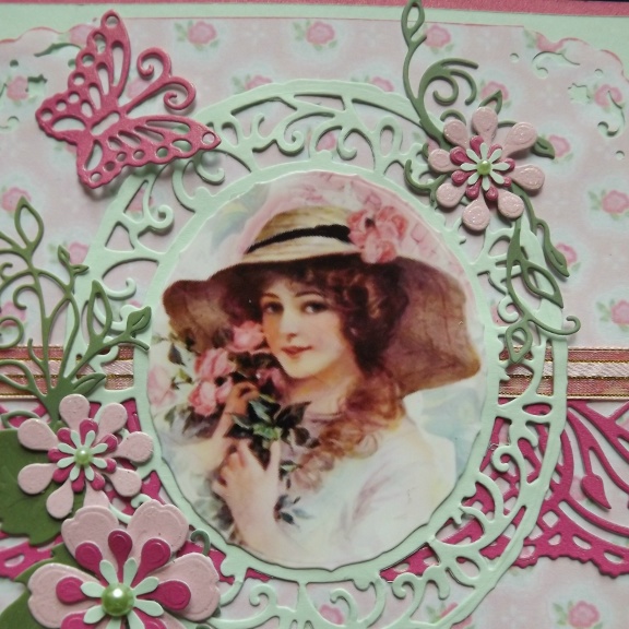 This is a 15cm/6" square card with a picture of a pretty vintage lady in a die cut fancy frame in a fresh mint green, it has been placed on a rose patterned background, then mint and pink layers, all on a white base card. I have placed a fancy die cut strip across the centre and trimmed it with a pink and gold ribbon and decorated with die cut flowers topped with pearls, foliage and a butterfly. The insert is blank, the envelope is white with a rose stamped in one corner.