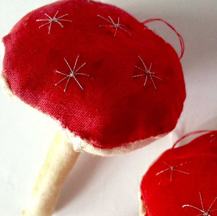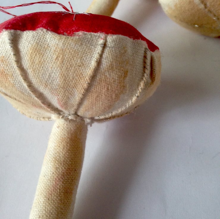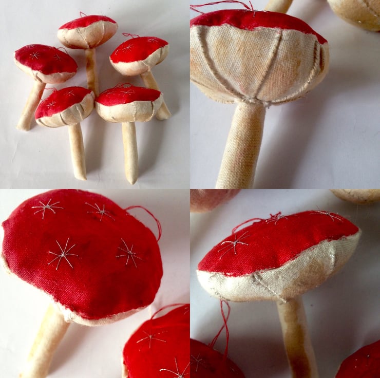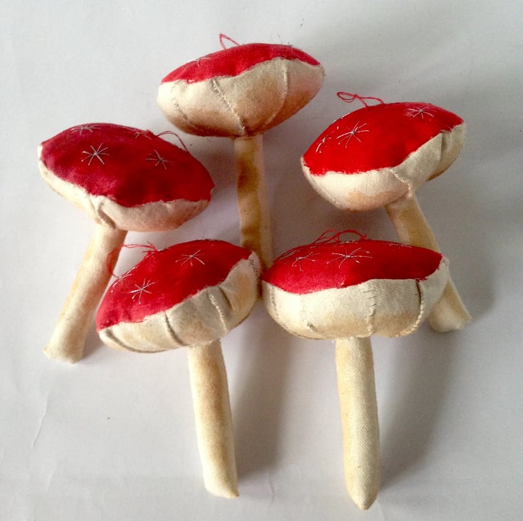 A set of five hand and machine stitched hand painted and stained toadstools.