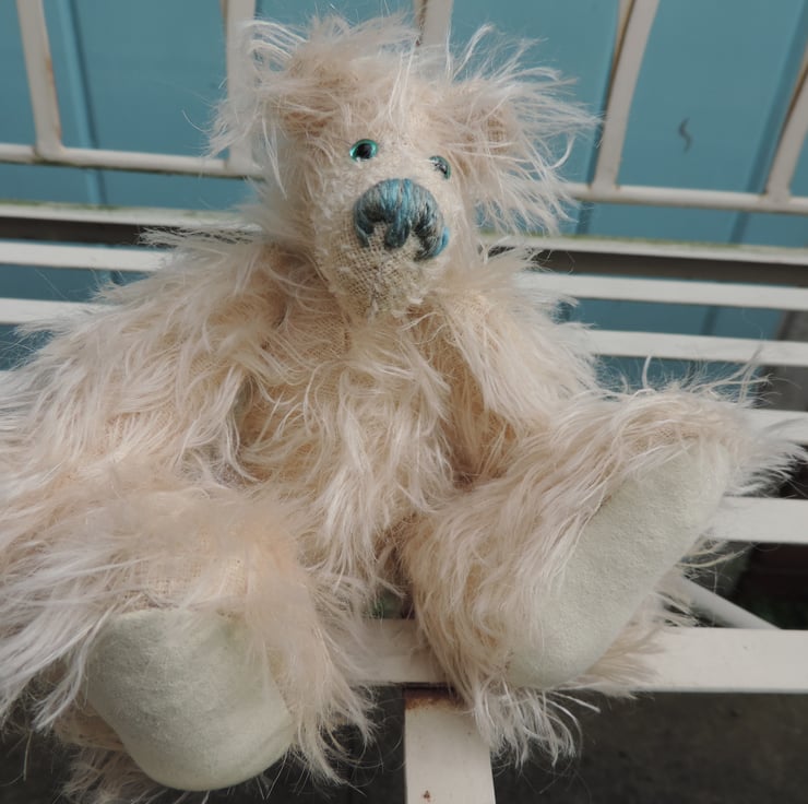 A sweet 7" hand sewn mohair bear in a winter white string mohair. Fully jointed with glass eyes.His nose is embroidered with hand dyed pure silk thread This is NOT a toy. Collectors item only.