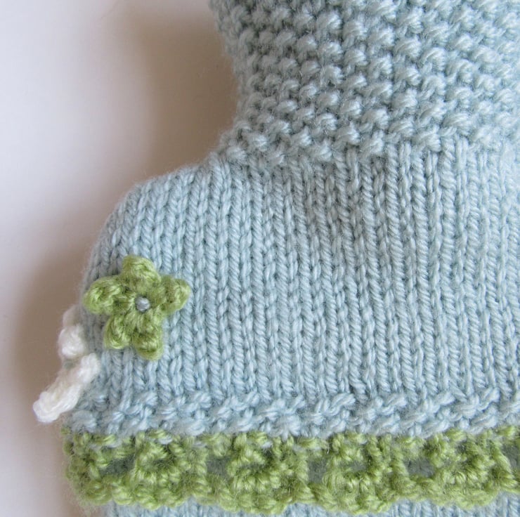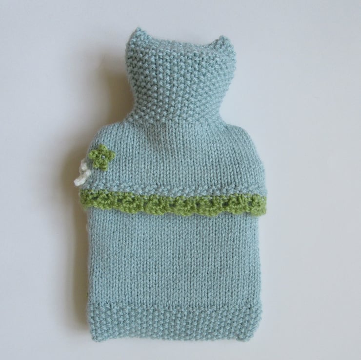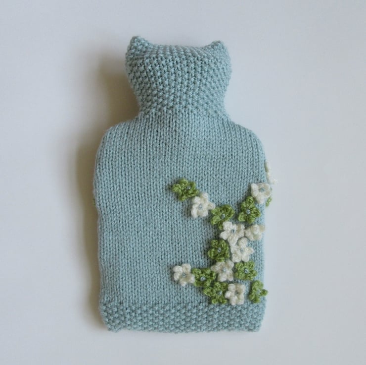 A hand knitted cool ice blue hot water bottle cover smothered in sweet ditsy blossoms.