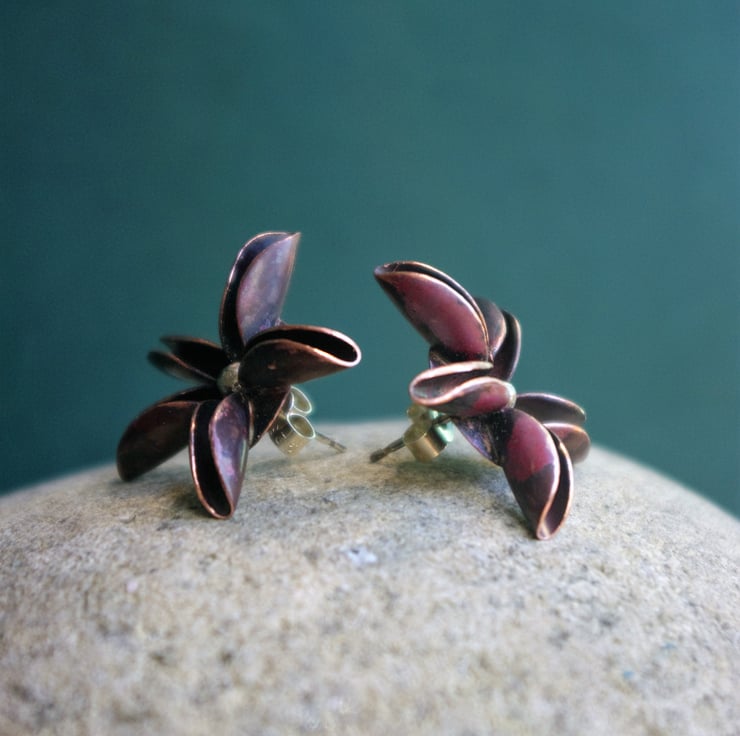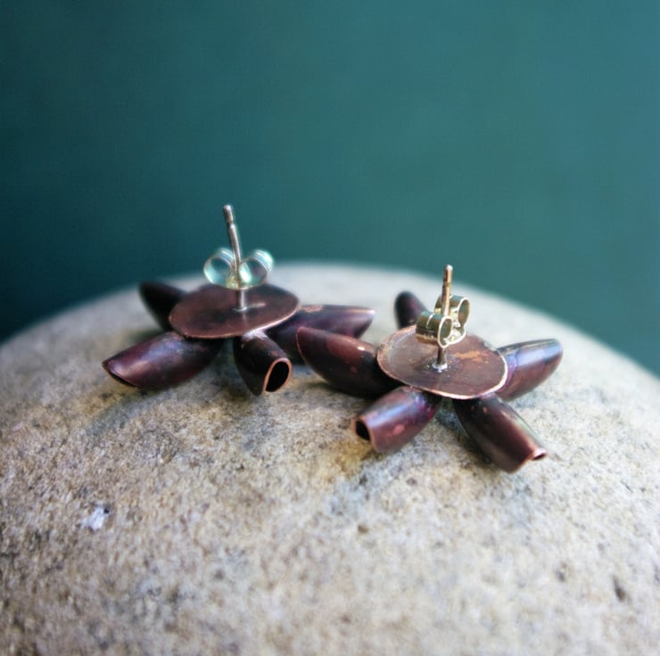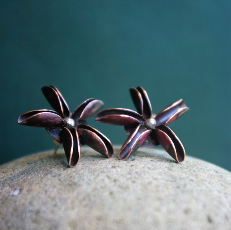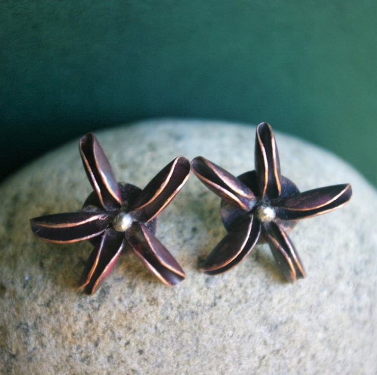 Inspired by a Star Anise pod, I have made studs out of folded copper with a sterling silver ball in the centre . The copper has been heat treated to produce reds and purples.