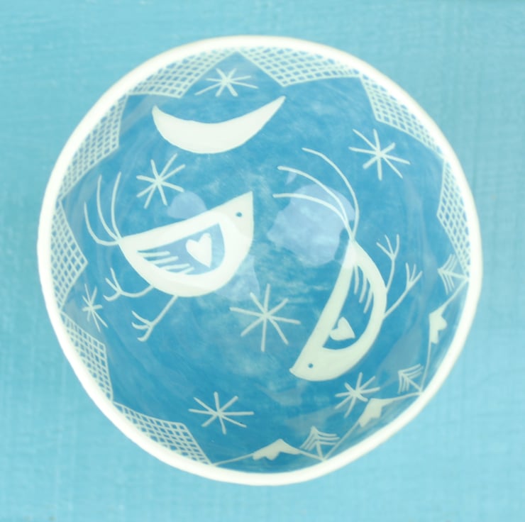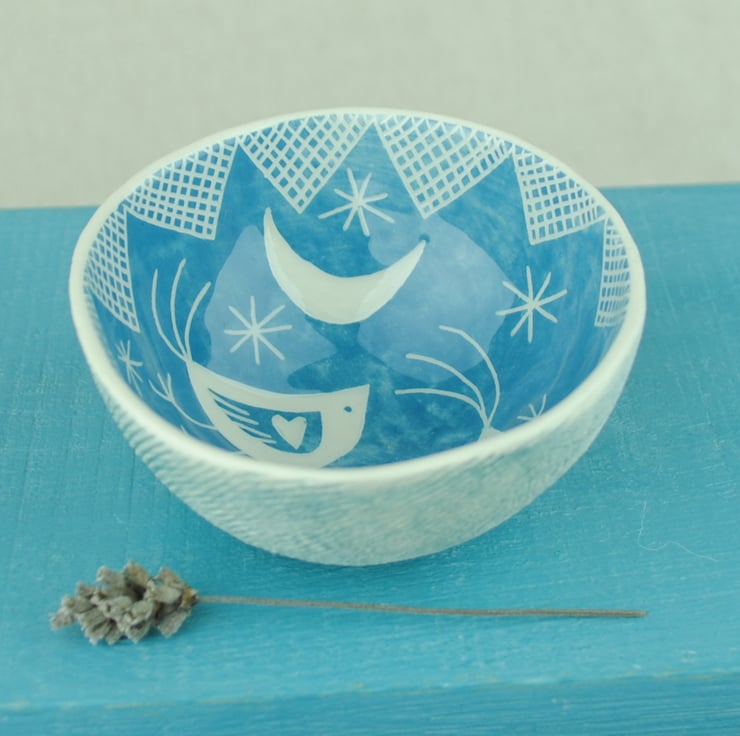 A lovely hand made small bowl with bird and moon design.