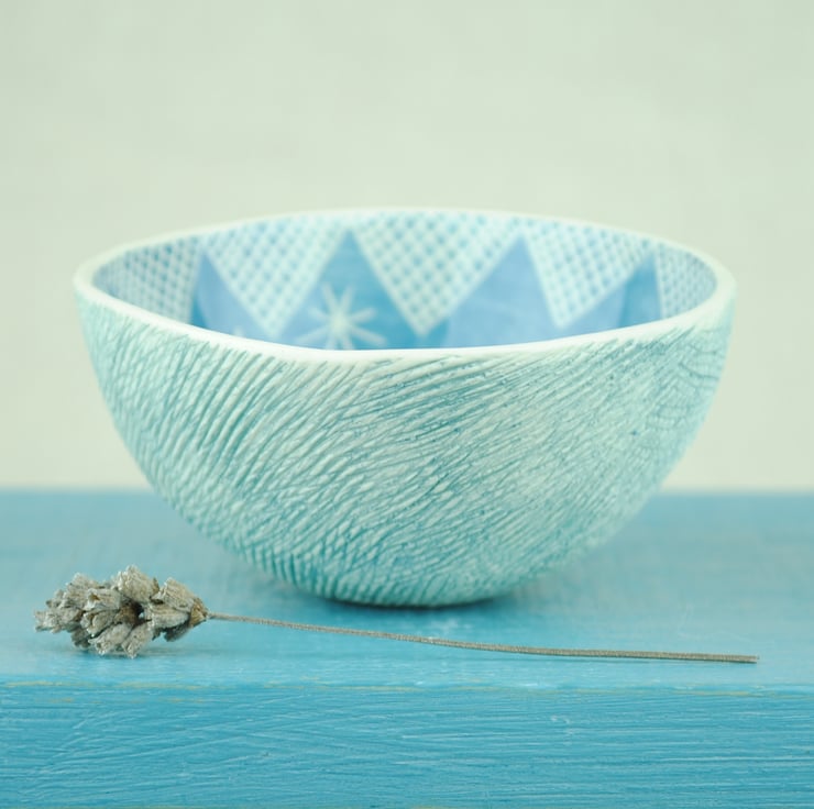 This small bowl is hand made from white earthenware clay. The inside of the bowl is decorated with coloured slip and finished with a hand drawn design using the scraffito technique. The outside of pinch bowl has a textured finish.