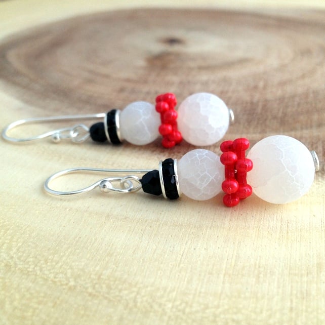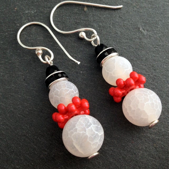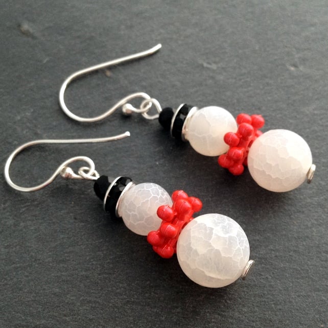 Each snowman has been made using frosted White Agate beads that look like perfect little snowballs. To keep his neck warm he wears a red snowflake bead scarf, his outfit is finished off with a hat made of a black rhinestone bead and fire polish crystal.