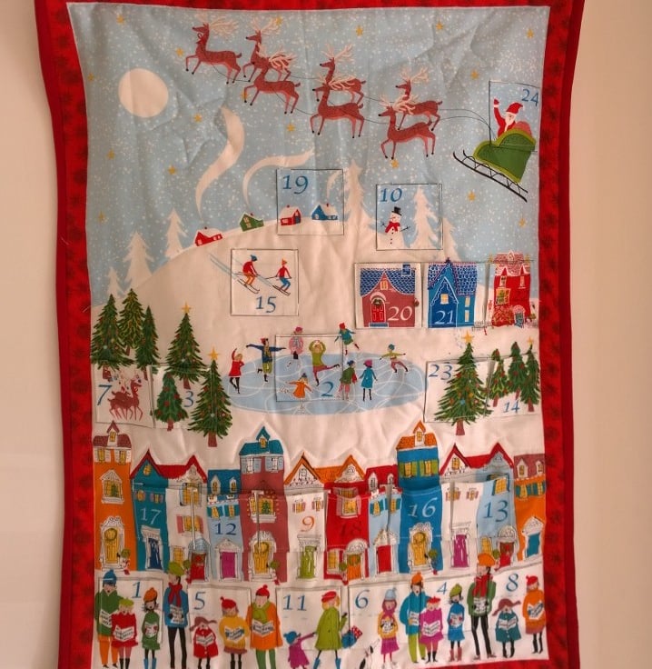 This handmade fabric advent calendar features a traditional Santa sleigh scene with 24 numbered pockets. It can be reused year after year and makes a lovely addition to any festive home.