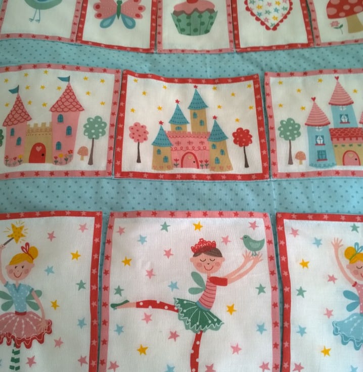 Made with a cotton front and patterned cotton on the back it measures 21.5" X 24" (55cm X 61cm). It has an 80% cotton / 20% polyester wadding and can be machine washed if needed.