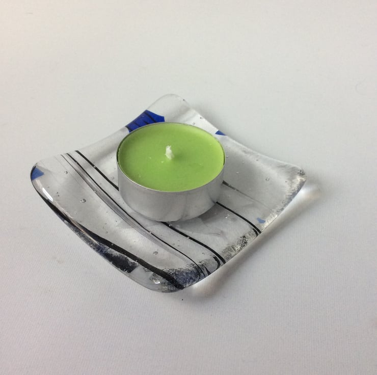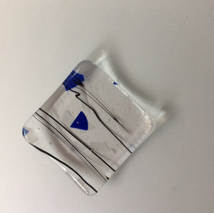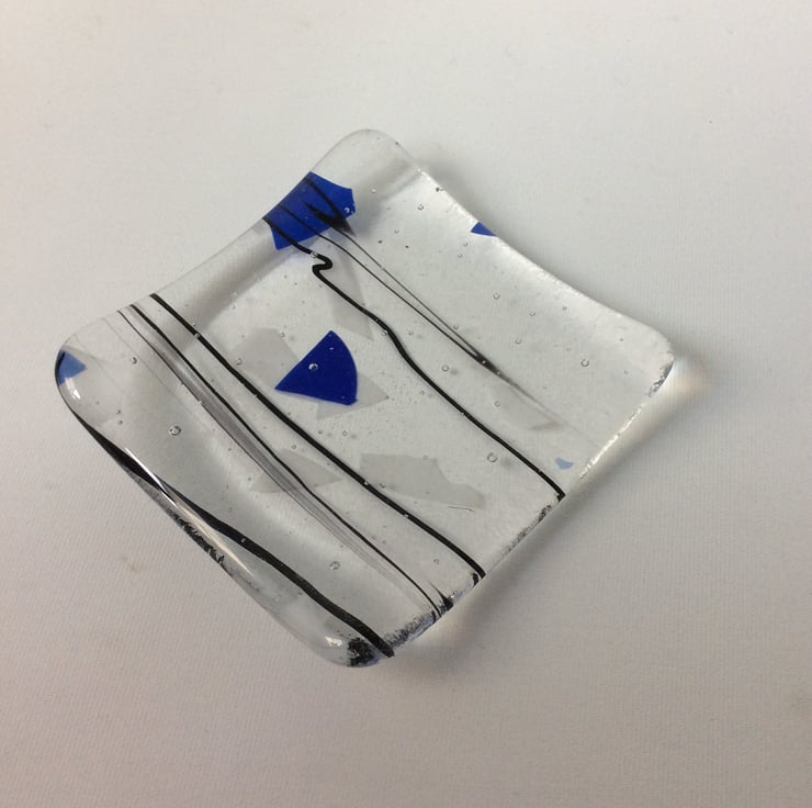 This trinket dish measures 75mm square and is 6 mm thick. It was made from a clear glass with a blue and white flakes and black stringers covered with a clear layer and then fused together in a kiln.