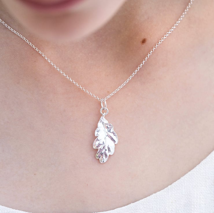 A beautiful sterling silver oak leaf necklace with all its pretty details captured. The oak is a symbol of strength and longevity. This pretty necklace makes a lovely gift for a nature lover.