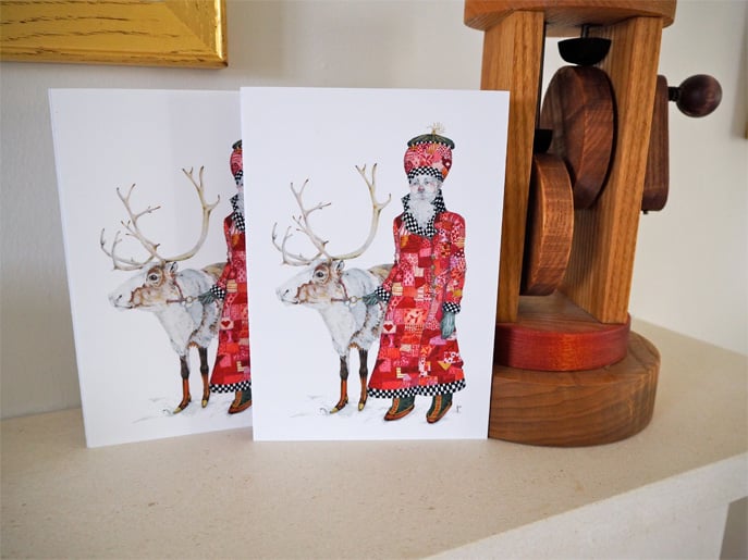 A print of Father Christmas and Reindeer printed with Epson archival ink on to epson archival paper, and applied to front of card. Supplied with envelopes.