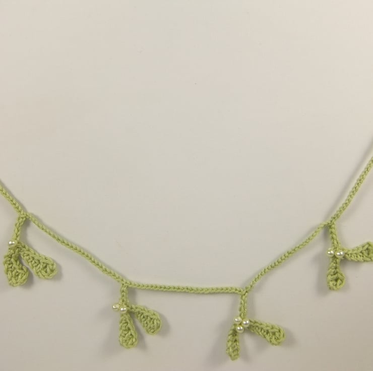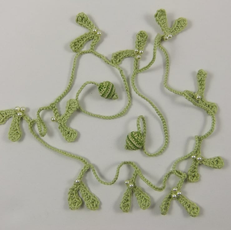A festive row of mistletoe to grace your home this Christmas. It is crocheted in 100% cotton and each little sprig has one, two or three creamy glass pearls for berries. The ends of the garland are finished off with a crochet- covered wooden bead for easy tying. The whole string measures approximately 135 cm. It comes wrapped in tissue in a labelled PIP (Postage in Proportion) box all ready to be given or posted as a gift if required.