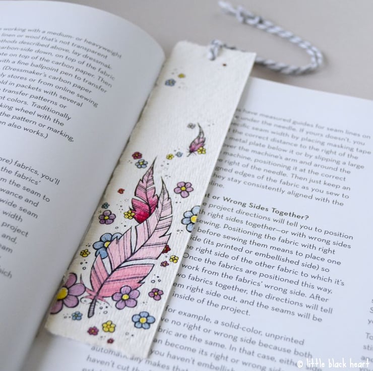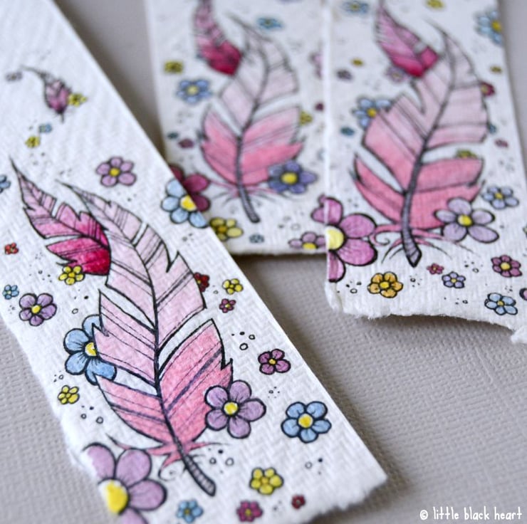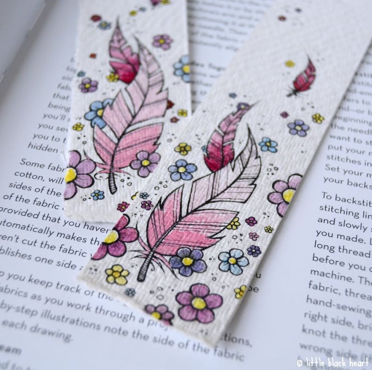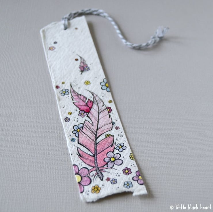 this handy little bookmark features some floating feathers, surrounded by pretty flowers.