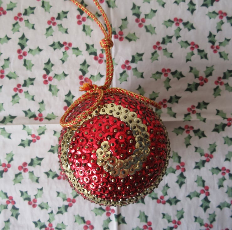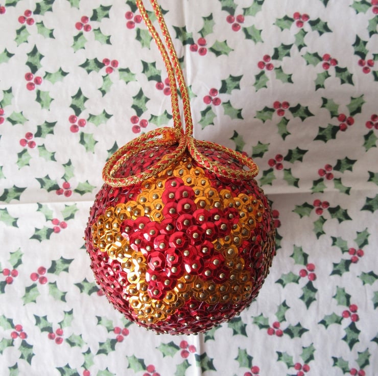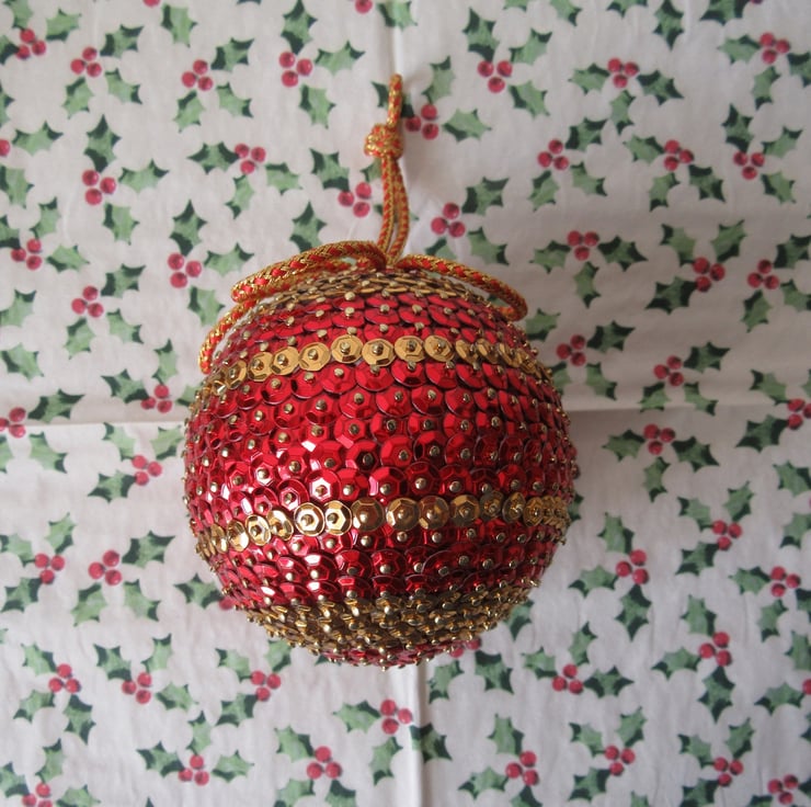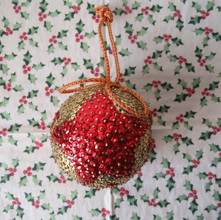 Each bauble can be hung on the tree with a beautiful red and gold lurex cord, pinned to the top of the bauble in a loopy manner.