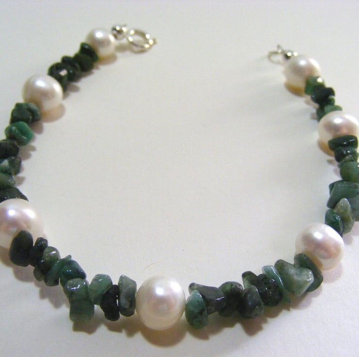 Precious gemstone bracelet is made by threading emerald nuggets and 8 mm white freshwater cultured pearls onto beading wire. Ends of the wire are finished with 925 sterling silver crimps and crimp covers. Clasp is a 925 sterling silver bolt ring clasp.