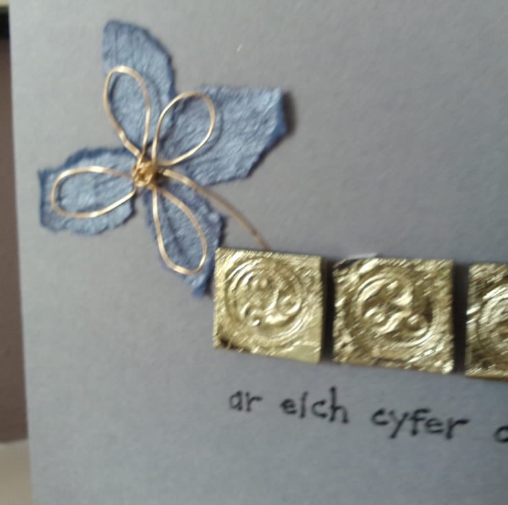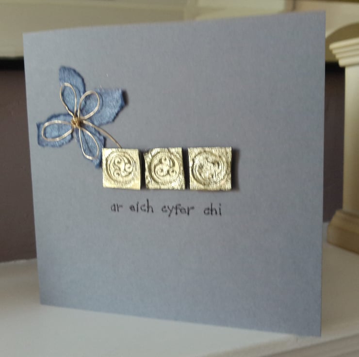 A completely handmade and uniquely designed card. Consisting of three squares of meldable plastic which have had a Celtic design stamped into it. Mounted in a straight row onto mid grey card. A flower handmade from gold wire with Wedgewood blue mulberry paper petals. Finished off with the words ar eich cyfer chi meaning just for you