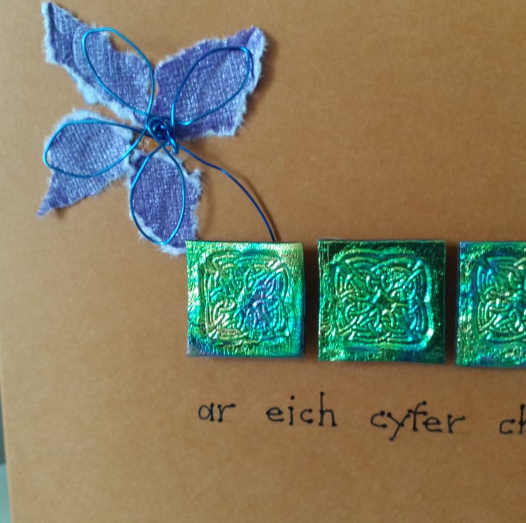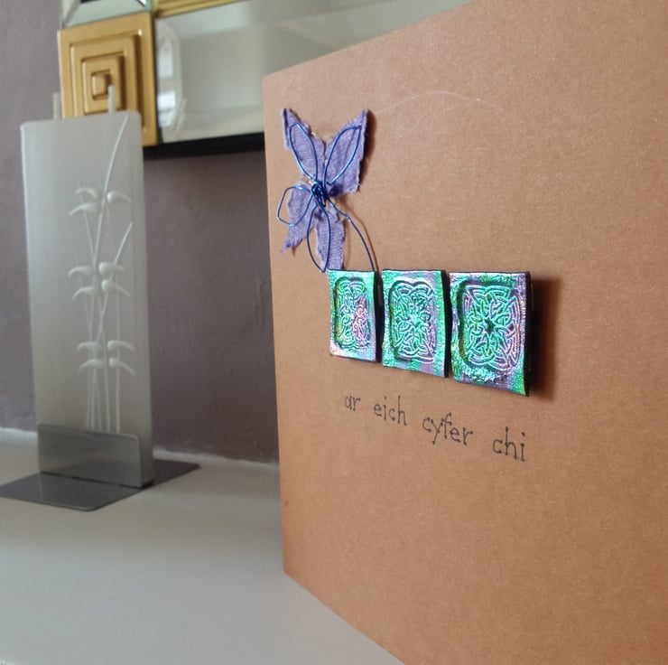 A completely handmade and uniquely designed card. Consisting of three squares of meldable plastic which has been embossed with a Celtic knot design. A handmade flower made from blue wire and purple mulberry paper. Finished off with ar eich cyfer chi meaning just for you. Mounted onto burnt orange card