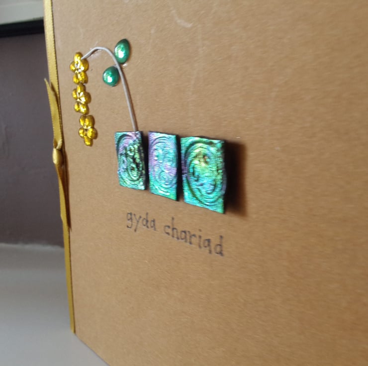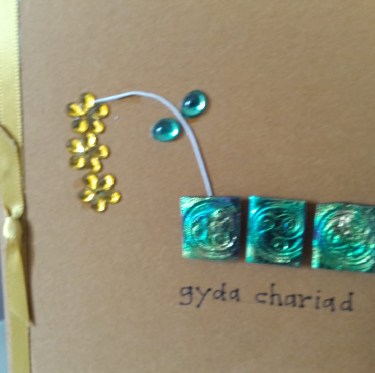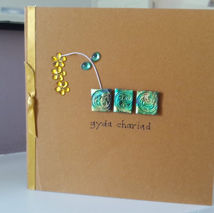 A completely handmade and uniquely designed card. Consisting of three squares of meldable plastic which has had a Celtic design stamped into it. A pretty flower handmade from white coated wire, gold and green beads. The words gyda chariad meaning with love handwritten in black ink. Finished off with gold ribbon and how