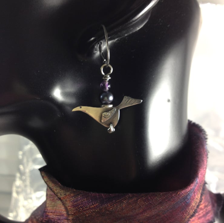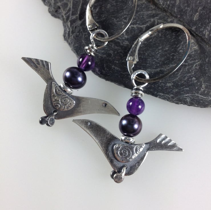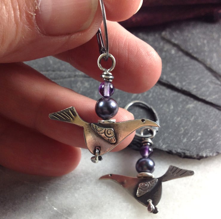 I have made some small silver birds with swirly wings and moving legs. The silver has been oxidised dark in the recesses .