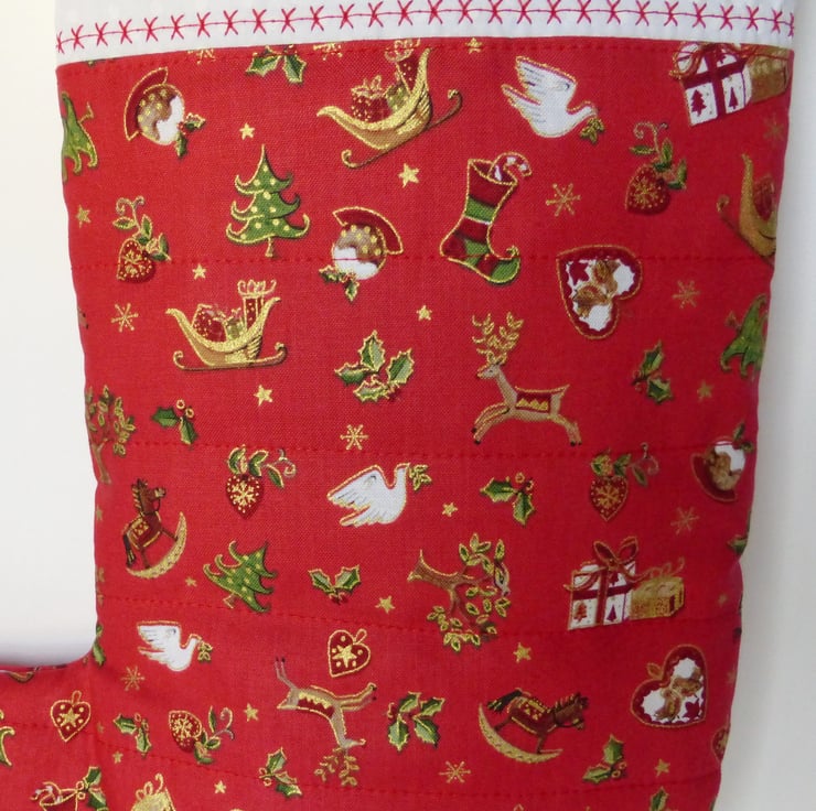 The stocking is lined in red cotton and there is a layer of polyester wadding sandwiched in-between which gives some body to the stocking. It has then been lightly quilted.