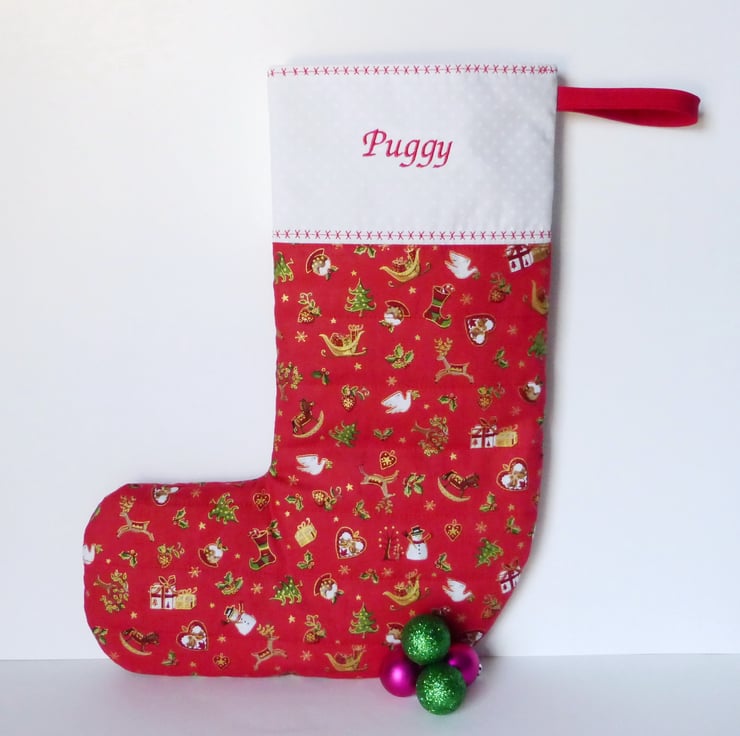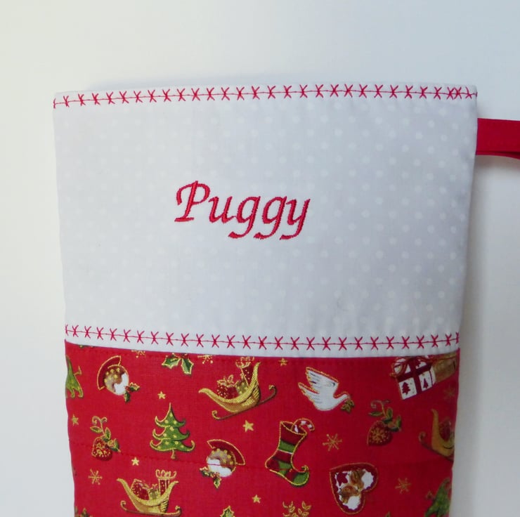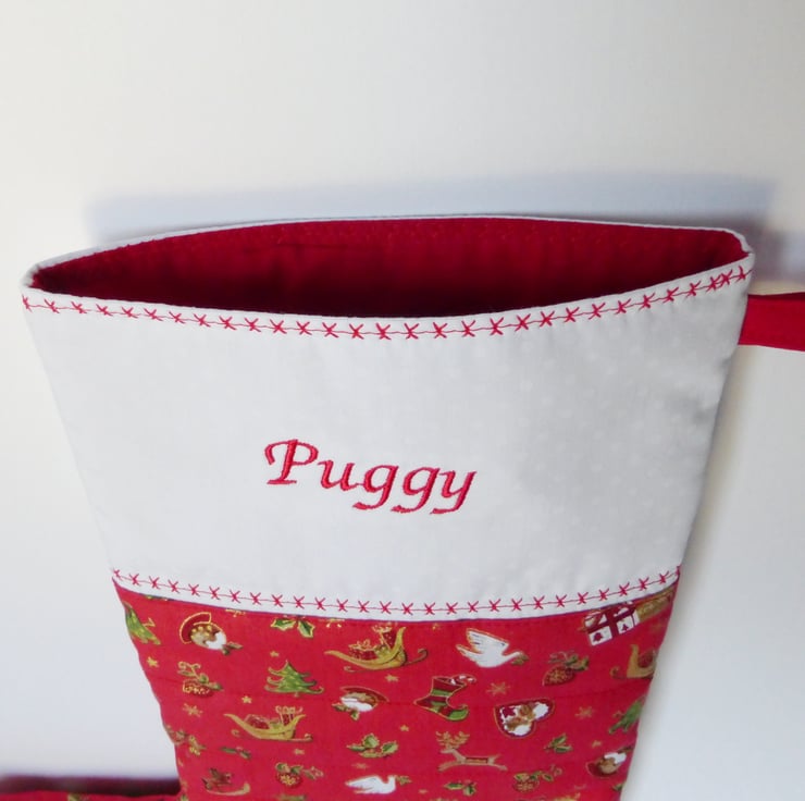 A lovely quilted Christmas stocking which can be personalised with one name embroidered on to the front in red. There is an embroidered Father Christmas on the reverse side.