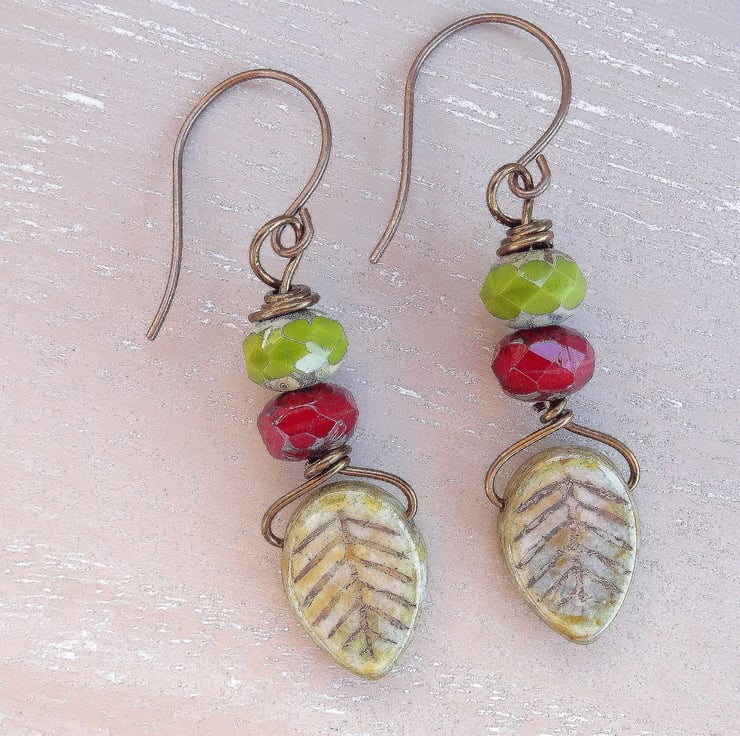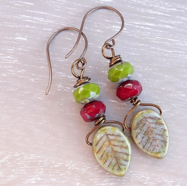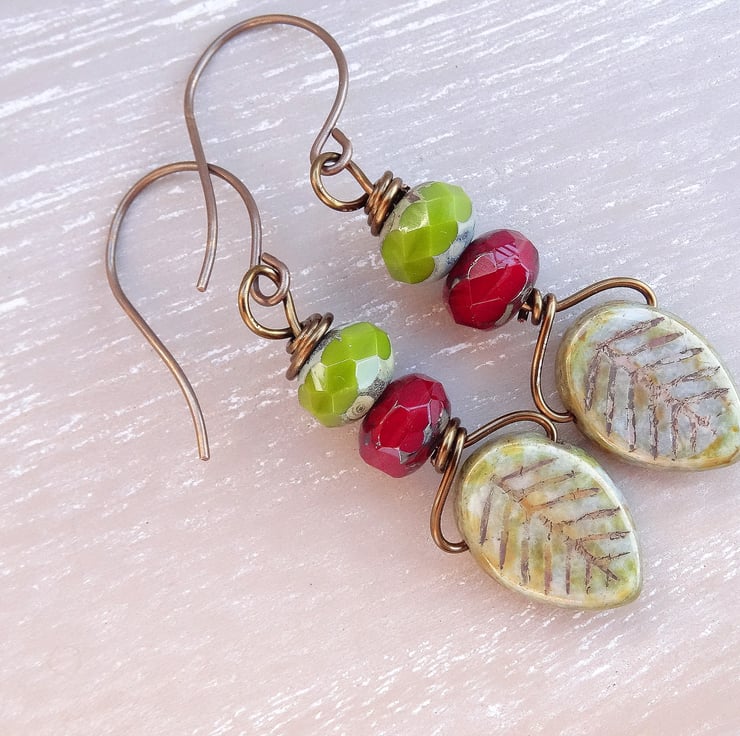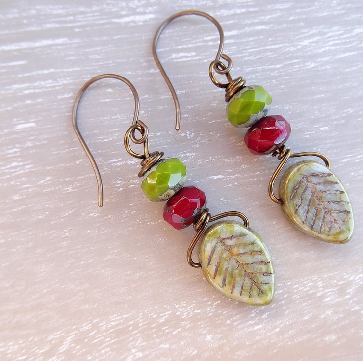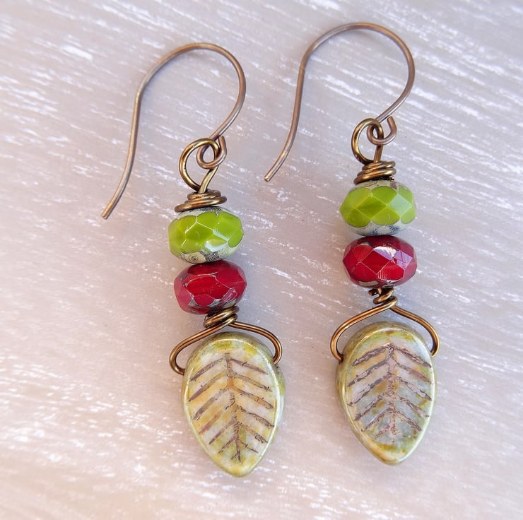 These are lovely earrings made with 15mm long czech glass leaves in a sage colour, to which I have added 9 x 6mm czech glass faceted rondelles with a picasso finish in olive green and ruby red. The earrings measure just over 2 inches (5cm) from top of vintaj brass, nckel free earwires.