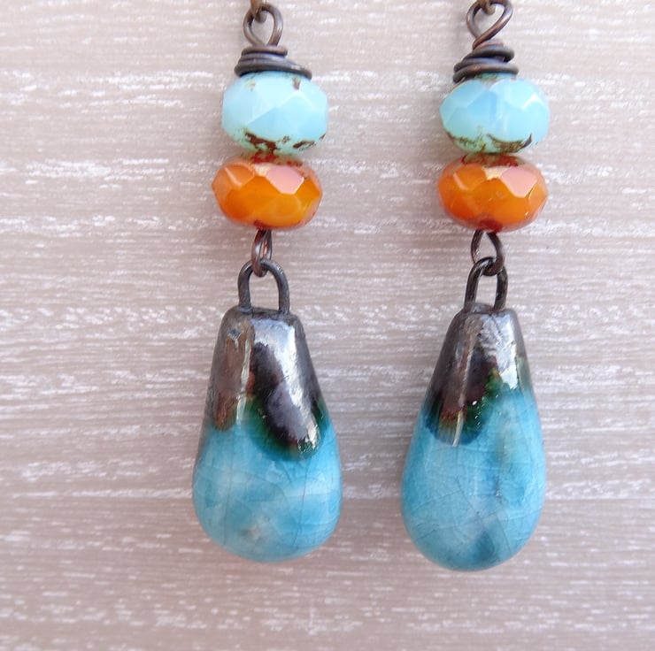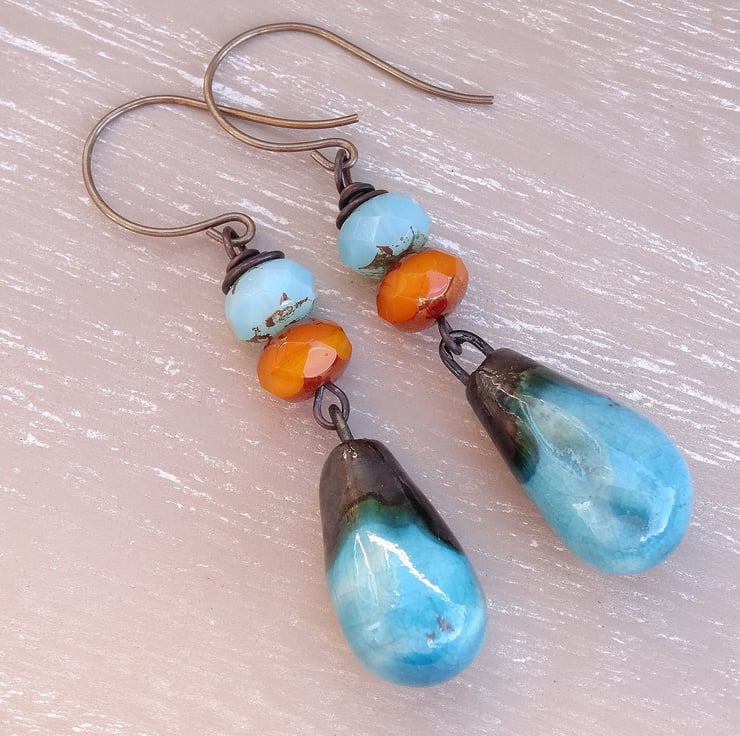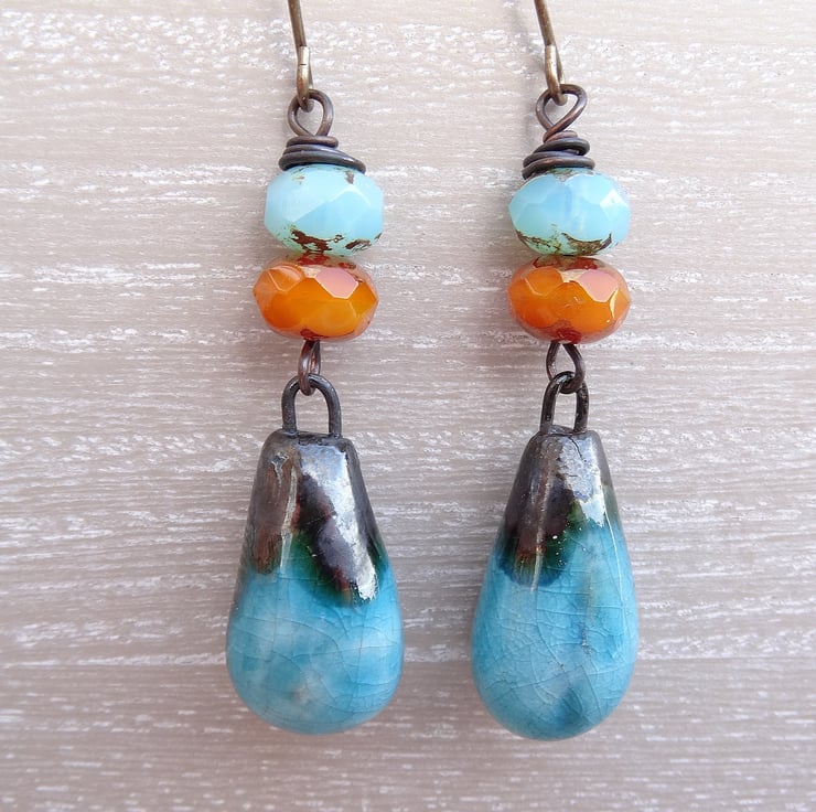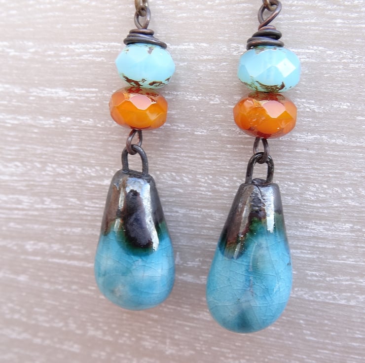 These are lovely earrings made with 20mm handmade ceramic bronzy droplets by Scorched Earth. To these I have wired 9 x 6mm czech glass faceted picasso finish rondelles in burnt orange and aqua. The earrings measure 2.1/4 inches (just under 6cm) from top of vintaj brass, nickel free earwires. As all of the items in my shop are unique, indivdual pieces made by myself, these are the earrings you will receive. They will arrive gift wrapped in tissue paper and a organza bag.