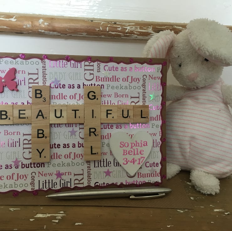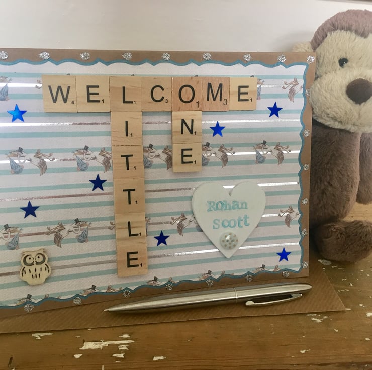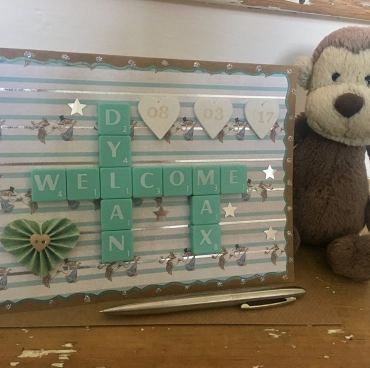Bespoke handmade Scrabble letter A5 new baby cards personalised to meet your requirements, crafted using top quality Kraft card. Cards are blank on the inside for your own message. The maximum number of letters that can be accommodated horizontally is 9, and vertically; 6. Tiles come in the following colour choices; black, white, ivory, baby pink, hot pink, red, purple, baby blue, vintage green or natural wood. A vast number of background card choices are available in numerous colours and designs; please contact me with your requirements to make your design truly unique!