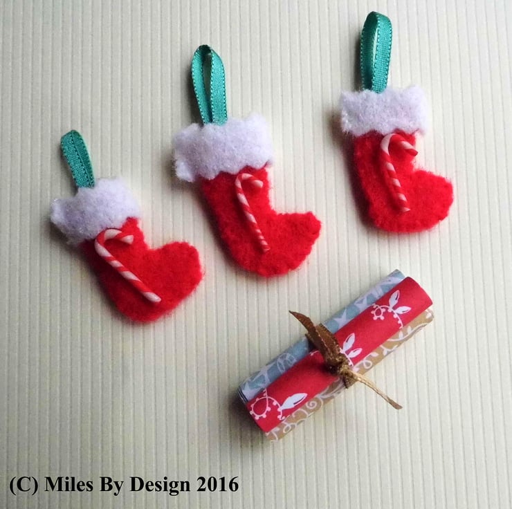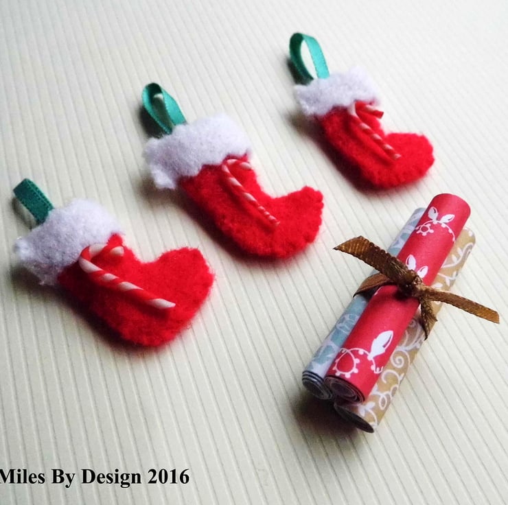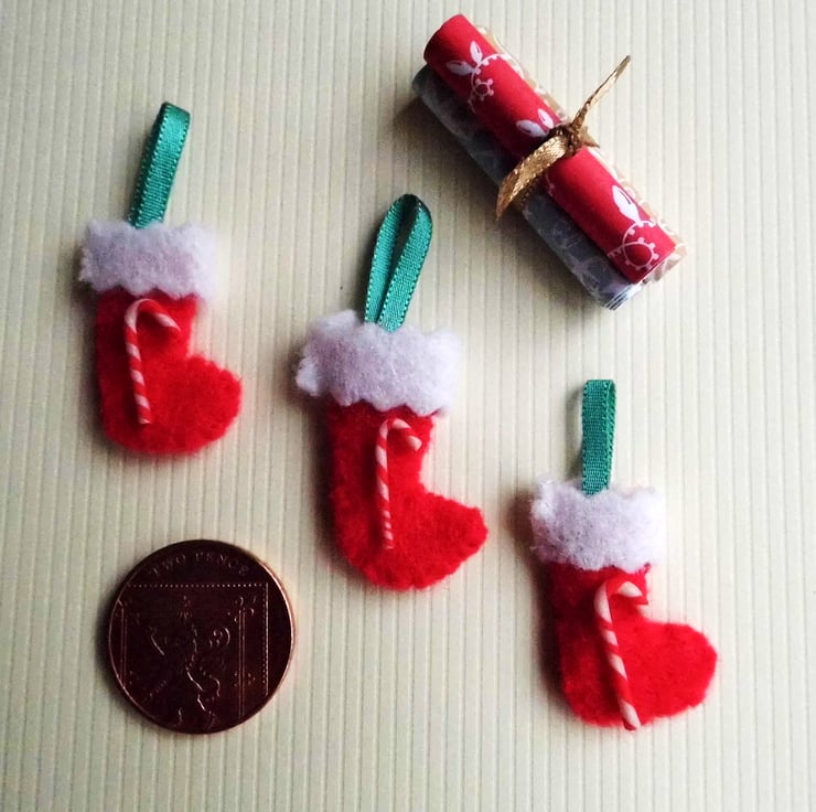 Dimensions Approx :(Stockings) 5cm x 2cm ( 2" x 0.75") - ( Wrapping paper bundle) - 4cm (1.5")