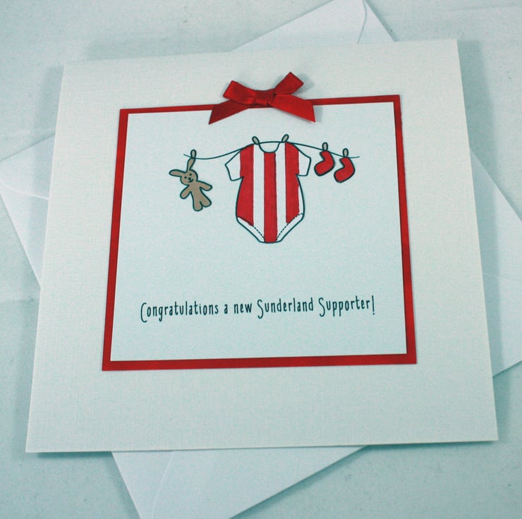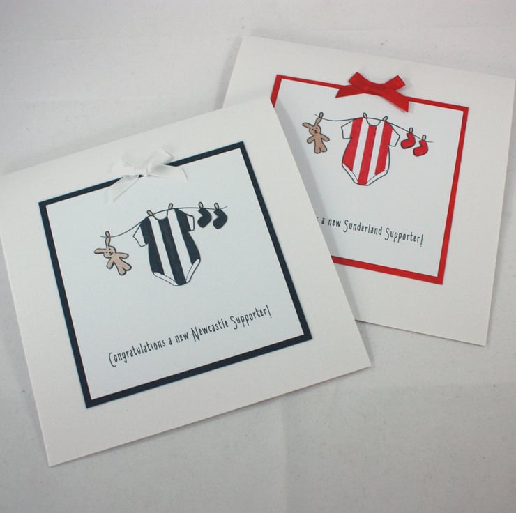 Square new baby card featuring an image of a washing line with baby clothes, which has been paper pieced in the colours of a football team, although I can do other sports on request.