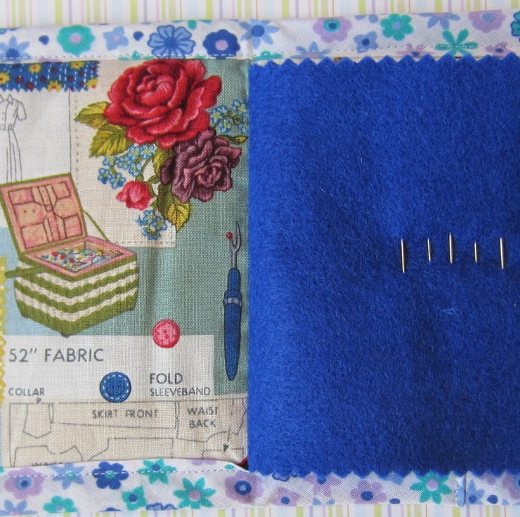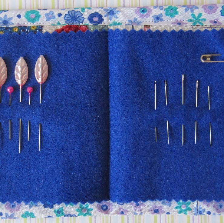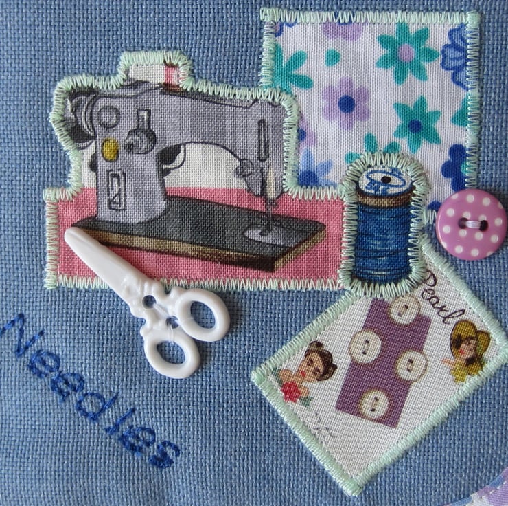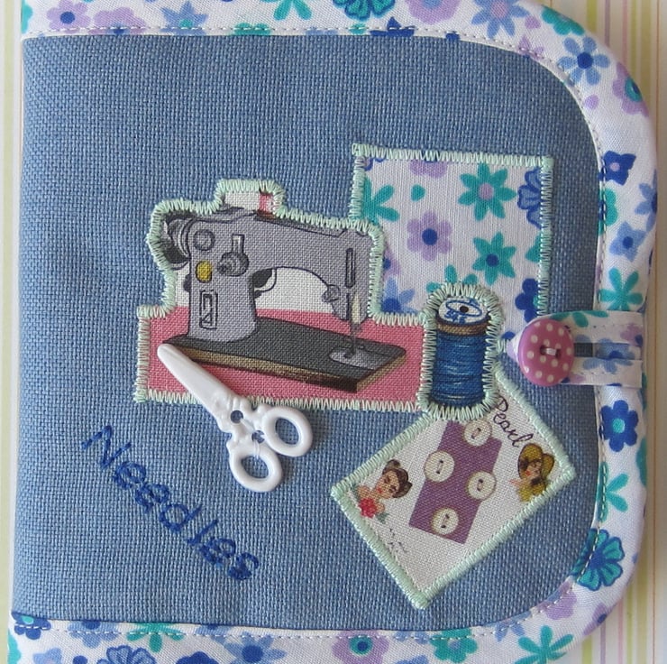 Lightly padded blue needle case decorated with appliqued sewing items and scissor button. It is edged with floral fabric and backed with sewing items fabric. Inside there is a dark blue felt page complete with pins, needles and a threader. It fastens with a loop and spotty button.