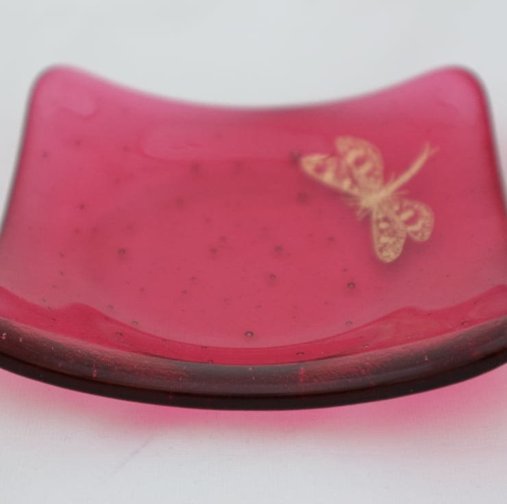 The dish has a transparent cerise base with a butterfly design and is approximately 10cm across. Please note that this is not a sticker but a real gold glass decal.Though designed as a trinket bowl, it might also make a good soap dish. An ideal present for someone you love.