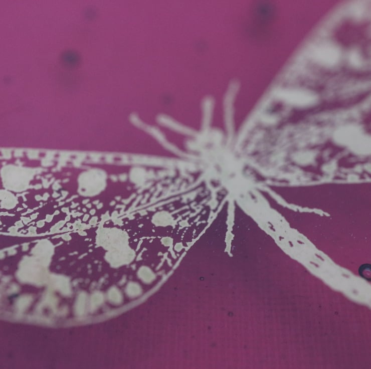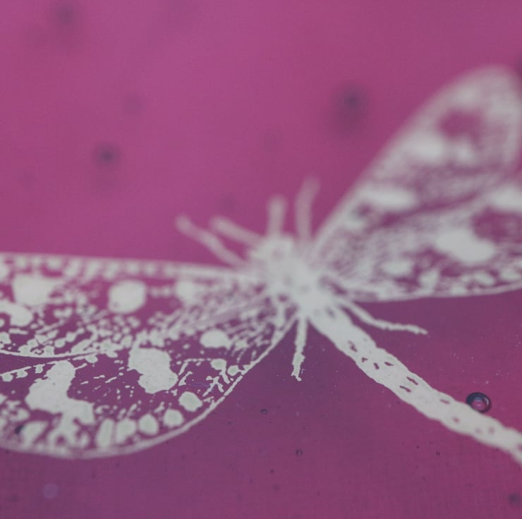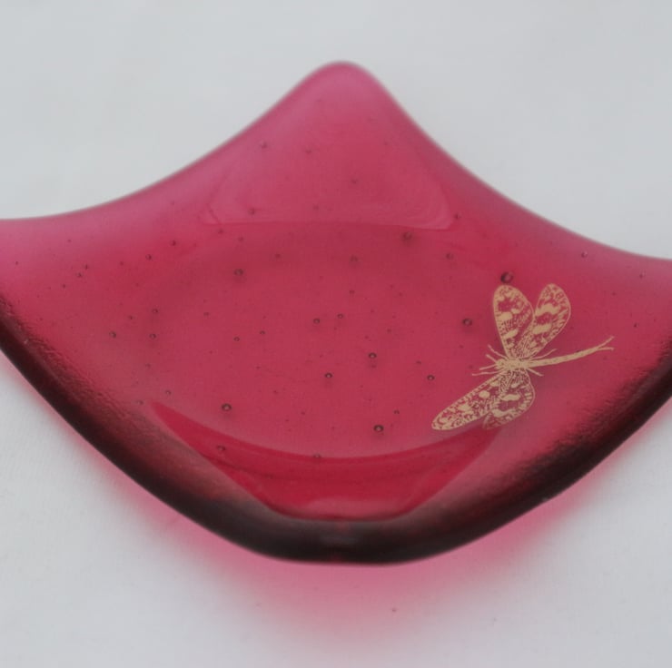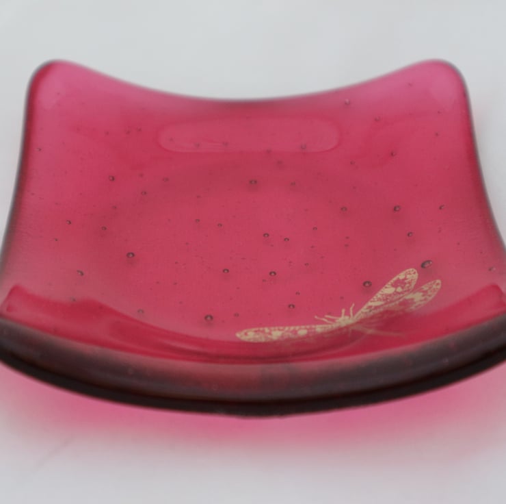This square trinket bowl was a happy accident. I had put in my kiln what I thought was a piece of delicate transparent lilac glass with the aim of adding a gold seahorse but when I opened the kiln I found a gorgeous jewel-like raspberry pink! It was obviously a striker glass which changed colour on heating. So instead of the seahorse I added a pretty gold butterfly.