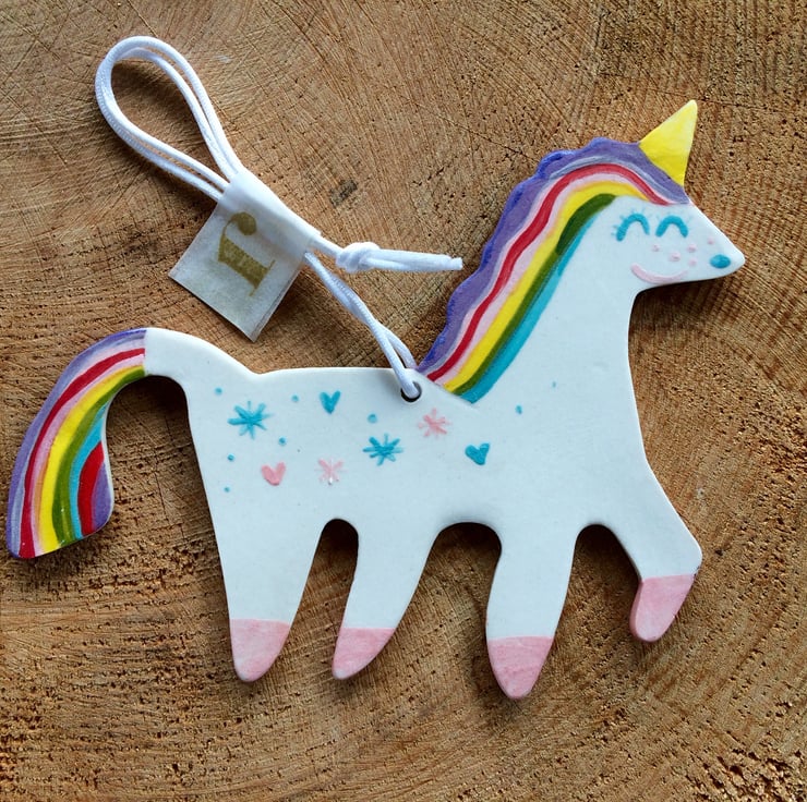 Handmade Rainbow Unicorn Porcelain Decoration.Painted on both sides and with a real gold lustre unicorn horn.