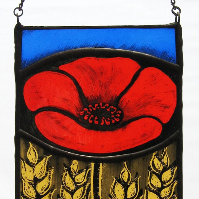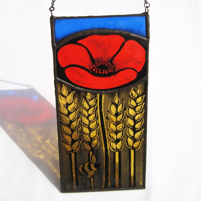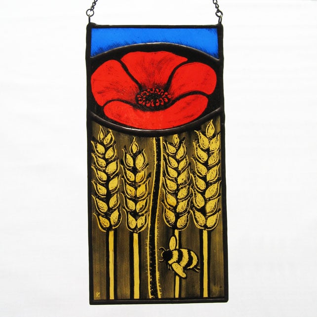 Created using traditional stained glass techniques and materials this panel has been hand painted onto antique style, red and amber glass and fired in a kiln. The tracing paint fuses together with the glass making the image permanent and enduring.