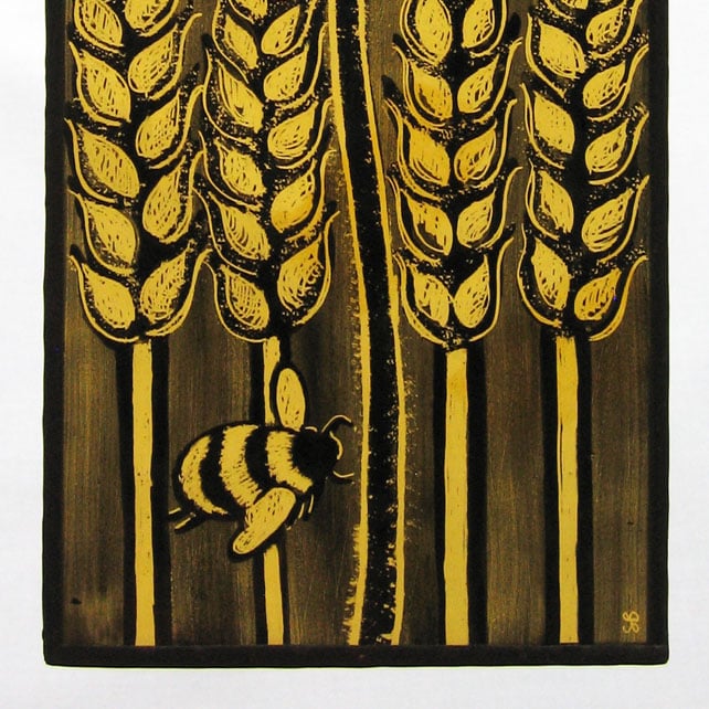 Summer and the red glow of a poppy growing amongst the golden wheat with a passing bumble bee.