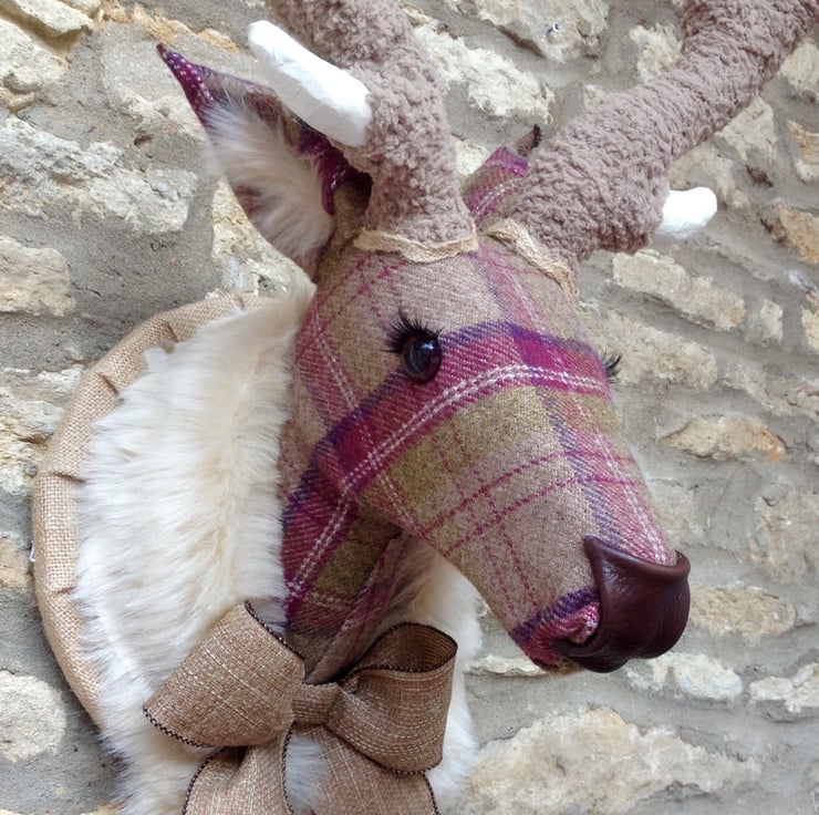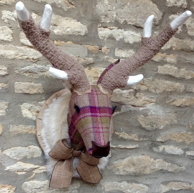 Handmade in a gorgeous autumn berry tweed fabric wall mounted stag deer.