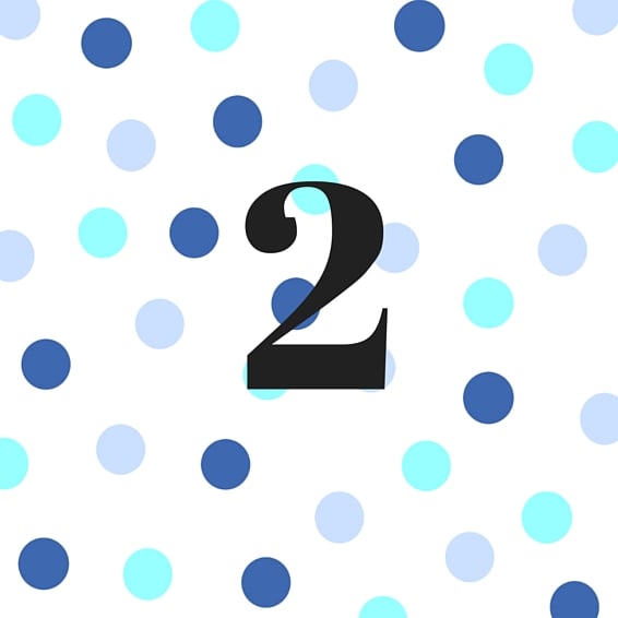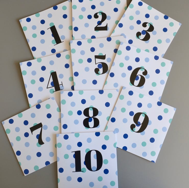 Kid's age birthday card with a dotty pattern in navy, light blue and aqua on a crisp white background. Age in black text in the centre of the card.
