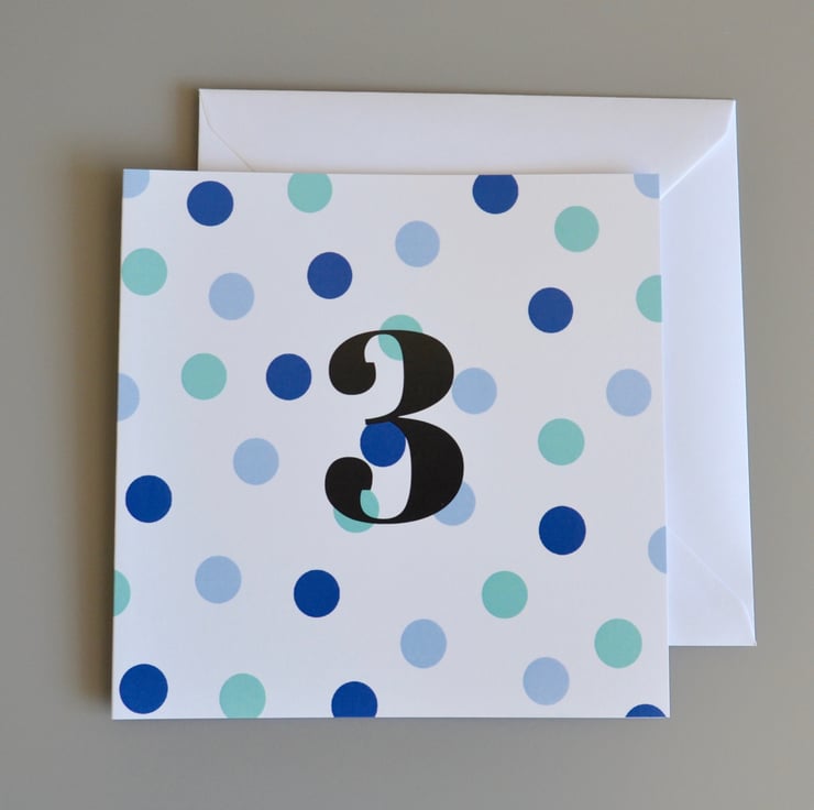 Kid's age birthday card with a dotty pattern in navy, light blue and aqua on a crisp white background. Age in black text in the centre of the card.