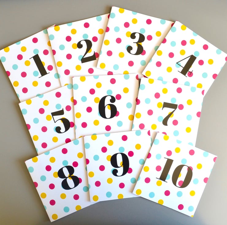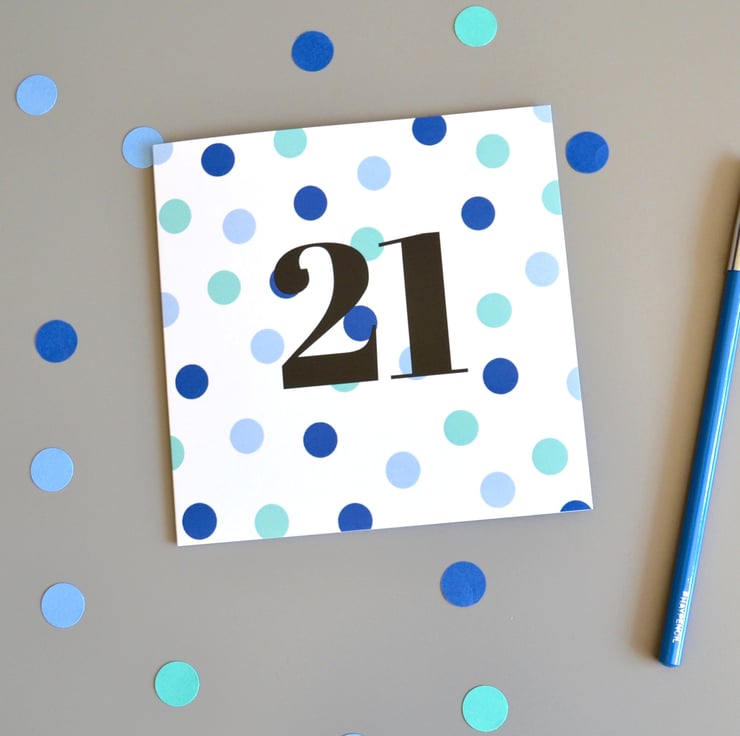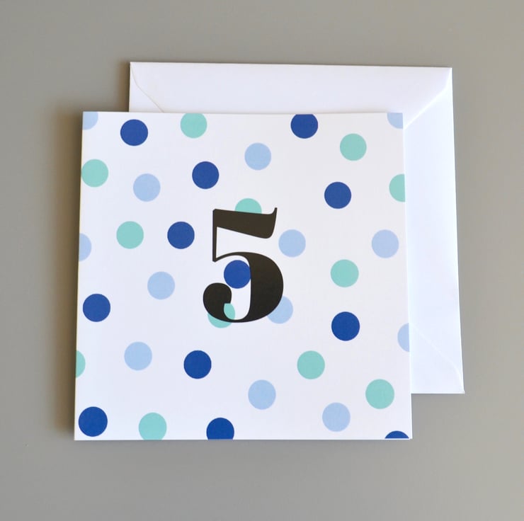 Kid's age birthday card with a dotty pattern in navy, light blue and aqua on a crisp white background. Age in black text in the centre of the card.