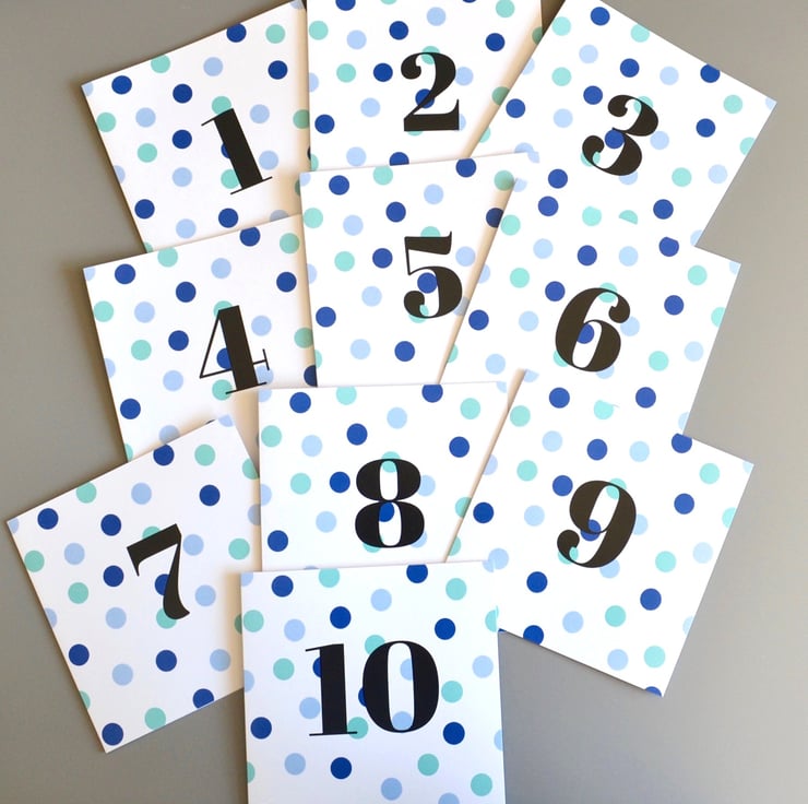 Kid's age birthday card with a dotty pattern in navy, light blue and aqua on a crisp white background. Age in black text in the centre of the card.