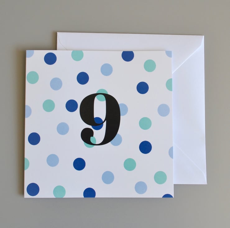 Kid's age birthday card with a dotty pattern in navy, light blue and aqua on a crisp white background. Age in black text in the centre of the card.