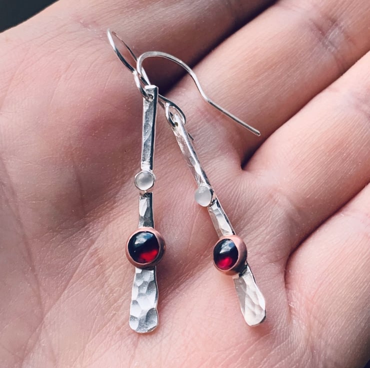 STERLING SILVER Drop garnet and moonstone earrings, Handmade Urban Design